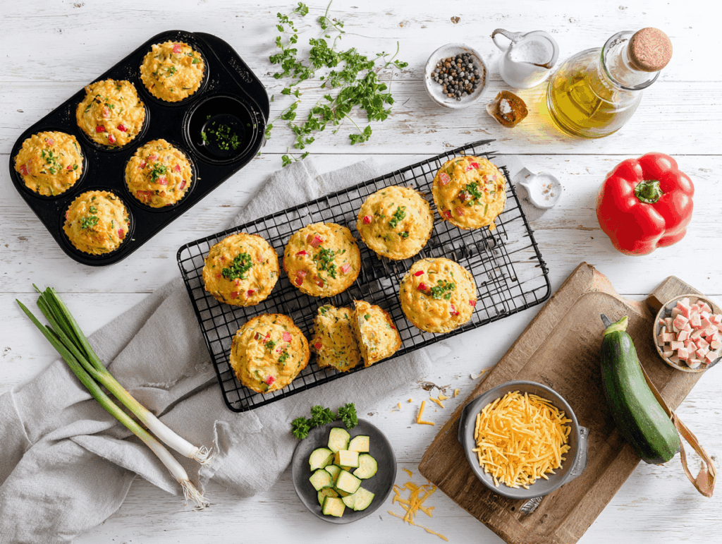 - Zutaten: 2 Eier, 50 g geriebene Zucchini, 1 EL Haferflocken, etwas Feta, Salz, Pfeffer – in Muffinförmchen backen