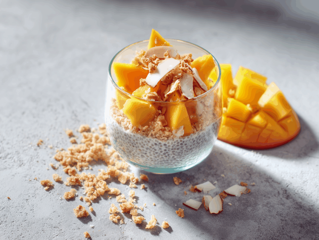 Sonntag: Tropiger Chia-Pudding mit Mango und Kokos-Crunch