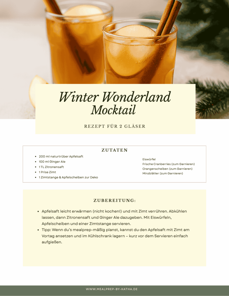 Besonders schön: Alle drei Mocktails sind mealprep-tauglich! Du kannst sie problemlos einen Tag vorher vorbereiten, im Kühlschrank aufbewahren und bei Bedarf leicht erwärmen oder frisch aufgießen. Ideal, wenn Gäste kommen oder du dir einfach selbst einen kleinen Wohlfühlmoment gönnen willst. Denn diese Drinks bringen Weihnachtsmarkt-Vibes nach Hause – ganz ohne Menschenmassen, Glühwein-Kater oder Stress.